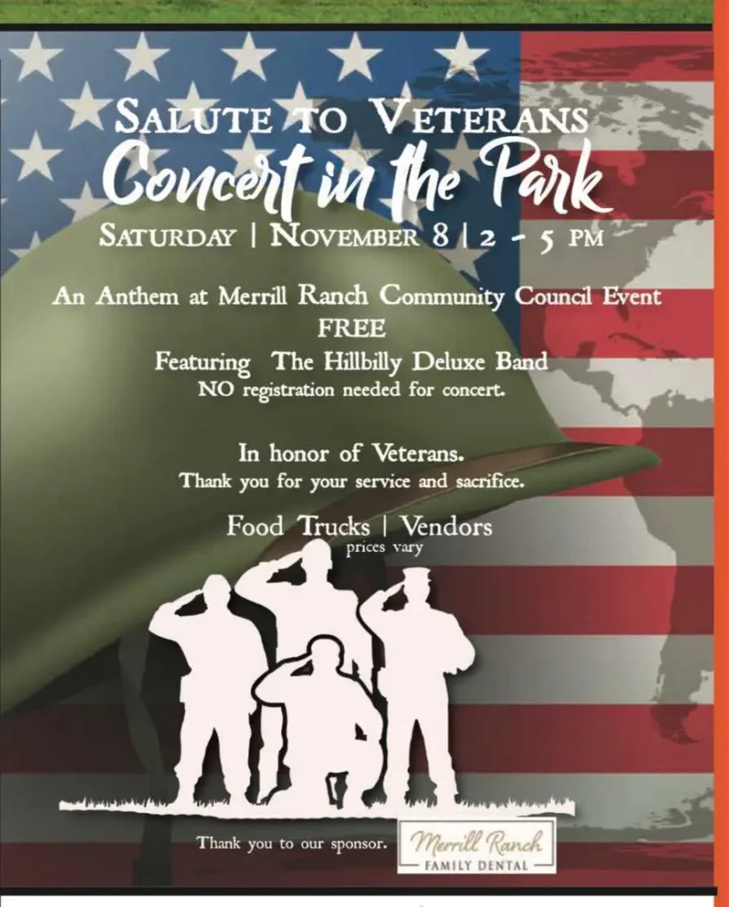 Come join us on Veteran’s Day! 👋 Merrill Ranch Family Dental will be giving out free water, popcorn and floss as we all enjoy this concert and honor our Veterans. ❤️💙